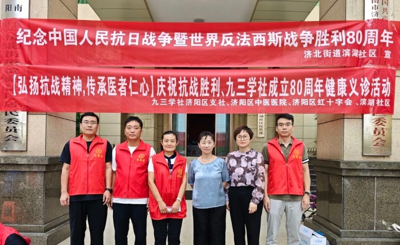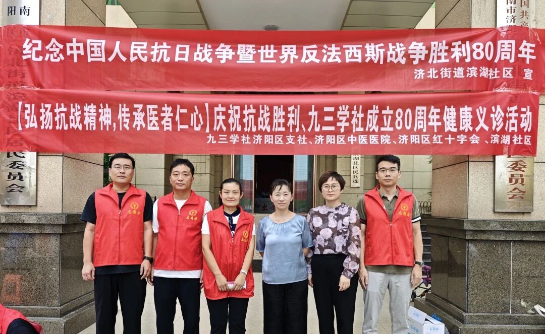 为纪念中国人民抗日战争暨世界反法西斯战争胜利80周年,庆祝九三学社创建80周年,9月3日,九三学社济阳区支社联合济阳区中医院、济阳区红十字会在滨湖社区开展“弘扬抗战精神 传承医者仁心”健康义诊志愿服务活动,为广大群众提供免费的医疗服务。